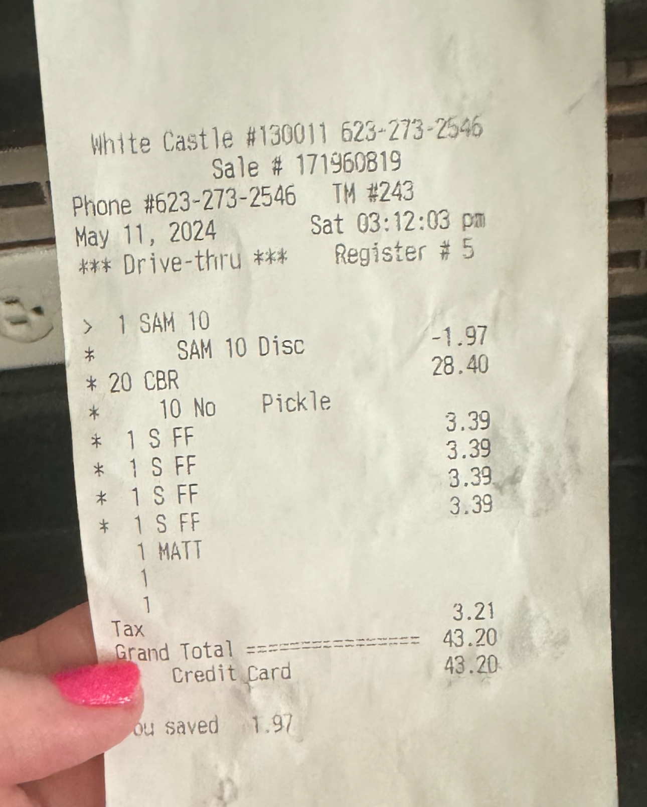 Read moreWhat a cluster (censored) this is. No parking unless you have a handicap plate or placard. You’re stuck going through the drive thru, and no one is directing traffic. When I finally pulled up to the speaker 🔈 and menu board, I’m asked for my name and vehicle make and color. Dead silence after that except for the background noise of the workers inside. “May I order?” “Yes, your name and vehicle?” 🤦♂️ 🙄 I place an order for their #8 combo meal. Ten sliders, two fries, and two drinks… medium with light ice. $26.25. I pull forward, pay, and receive my order; only I’m handed two different size drinks. What’s the point of getting it corrected. No one seems to care when the mistake is pointed out. The sliders are as I remember them. The fries were better than the greasy fries I’ve had at the Scottsdale location; yet they’re a bit overdone. I won’t be returning anytime soon, and recommend others stay away if you’re short on time. It is a huge mess as Tempe P.D. was on hand with cones to limit and direct the flow of traffic. Management could have done better directing traffic in their parking lot and drive thru. They could learn a few things from In-n-Out on how to get customers in through the drive-thru. And open up your parking for anyone wishing to dine in. I had an hour to do so, but felt pushed out and discouraged. Not a kind way to...