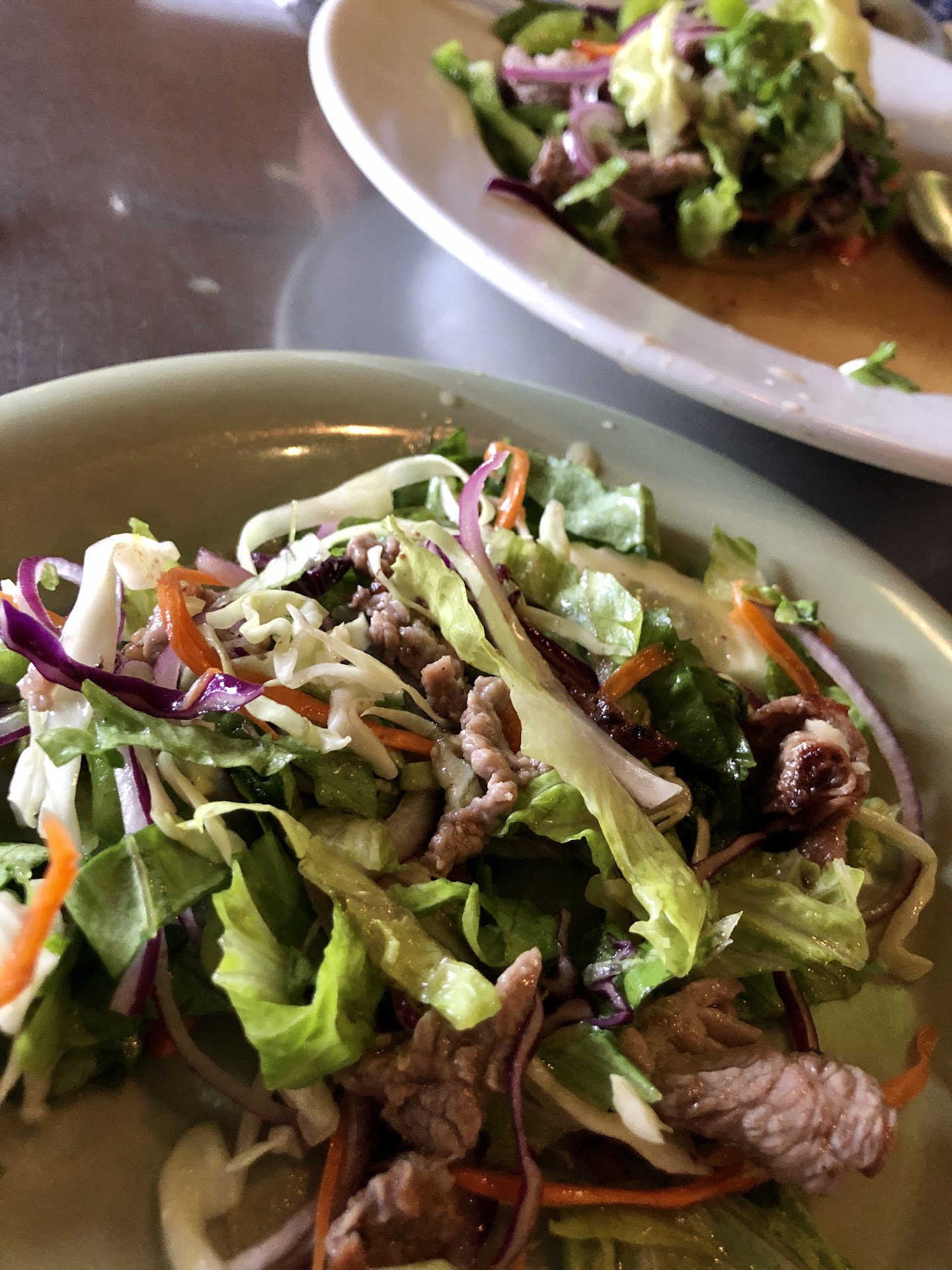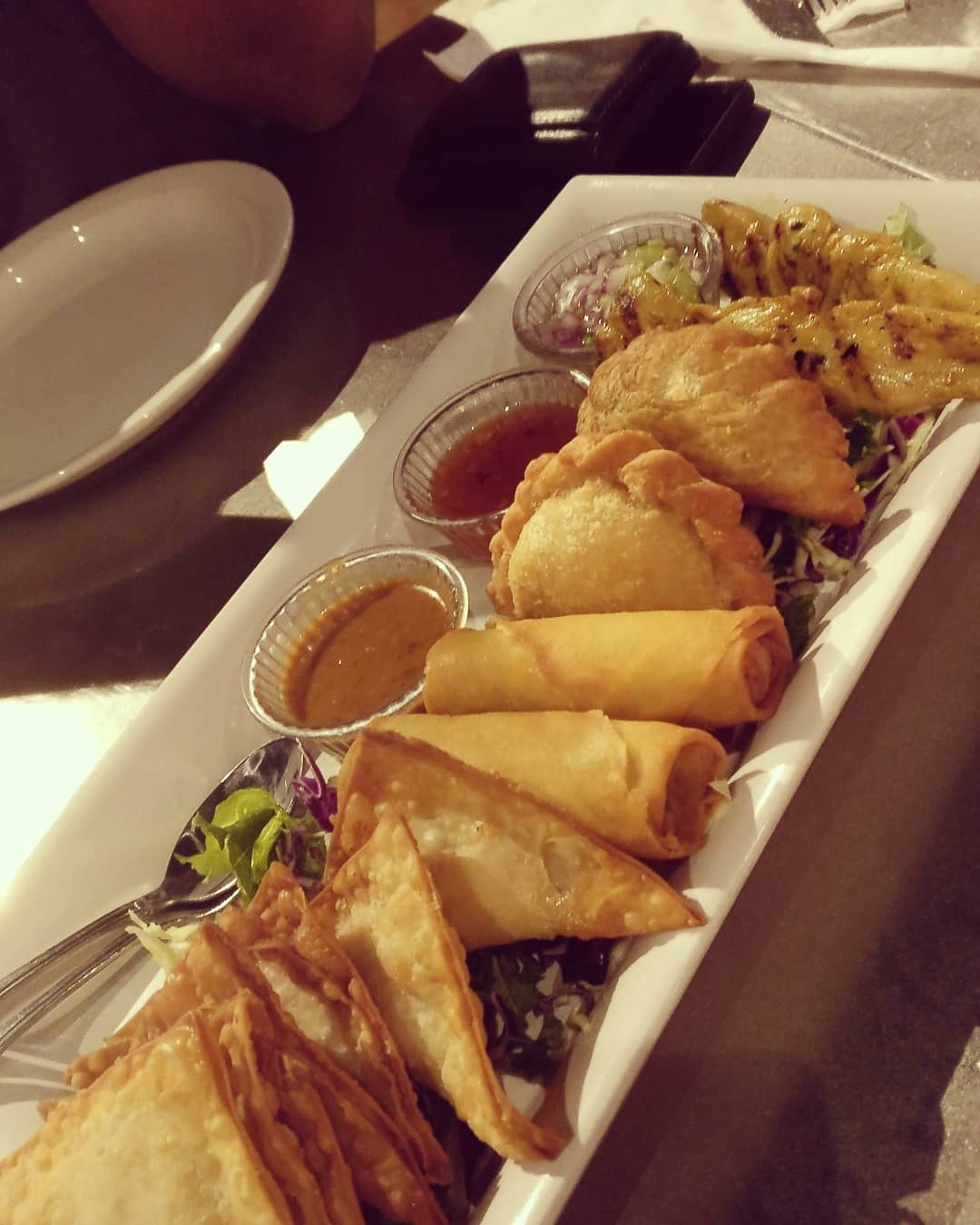 Food we ordered during our last visit. Sampler: Thai rolls (2), golden curry puff (2), Satay (2), and Kew Krob (6).