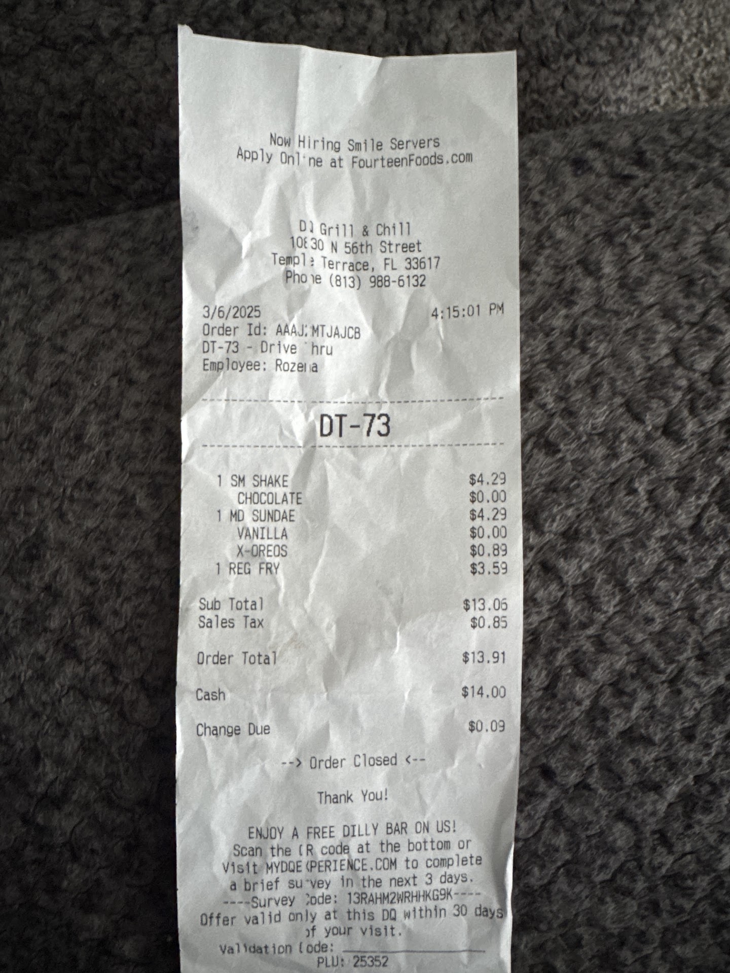Read moreNEW EDIT AS OF APRIL 2025: As you can see (original review below) previously we loved this place. Too many changes have occurred and I no longer recommend this restaurant. The staff could care less, the managers are non existent or don't know what they are doing. We ordered a cake for my birthday and after several days of excuses got the cake the day AFTER my birthday and didn't even get the cake we ordered. Gave us this crappy oreo blizzard cake which sucked and had all kinds of crap on top of it. It had a ton of sprinkles. I absolutely hate sprinkles. I don't like them in cake. I don't like them in ice cream. So of course this one was absolutely covered in them. My husband was basically told this cake or nothing and they refused to refund our money. We ordered the original for a reason. It's the one and only thing I ask for on my birthday every year and we had to take the disappointing oreo blizzard cake. And I didn't have a cake at all on my actual birthday because they kept making excuses and refusing to give us the cake we purchased. My husband had to go to the store 3 times to get any cake at all. I sat there choking down the cake and hatint every bite. I told my husband from now on just make me a sad boxed cake from the grocery store, at least I'll get the flavor I want. I will miss the DQ ice cream cake, it was my favorite.