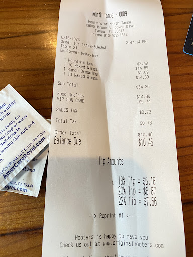 Read moreOrdered (20) All Drums Hot Wings, (12) Blue Cheese, (2) Curly Fries from Hooters through Uber Eats. Only received the Fries first time from delivery person (bag felt light but she said that was all they gave her). Then filed Missing Items from Uber Eats after speaking with a Manager Richard at Hooters, who assured me he would oversee the next order I placed to help ensure that it would be correct. Placed a New Order for the same (20) All Drums Hot Wings and (12) Blue Cheese, wouldn't you know it, they again forgot 1/2 the order (10) Wings and Kennedy rang the order up incorrect as (10) Wings on their Receipt stapled to the bag. But I did pay and order from Uber Eats (20) Wings, so it was most definitely Hooters that made the mistakes. Called Hooters and the lady that answered the phone said they were busy and she was Rude to me, finally put me through some other Manager who indicated Richard was not there now and that I would need to again contact Uber Eats (he didn't listen that i had their incorrect receipt so was not an uber problem), then to make matters even worse he abruptly hung up on me afterwards. Terrible they couldn't get a Simple Order Correct Two Times in a row and Horrible business etiquette that they did not want to make anything right on any level, such as perhaps offering to send me a small gift card for the (10) Missing Wings or a even a Dinner on them. They do NOT even deserve the (1) STAR that I gave them and not sure how this place stays in business. Very very very Disappointed in their Establishment and Management or complete lack of to be more precise !!! I've included PICs as indisputable undeniable proof for my review to have substance, lucky Uber Eats was nice enough to issue me a partial refund, they treat their customers...