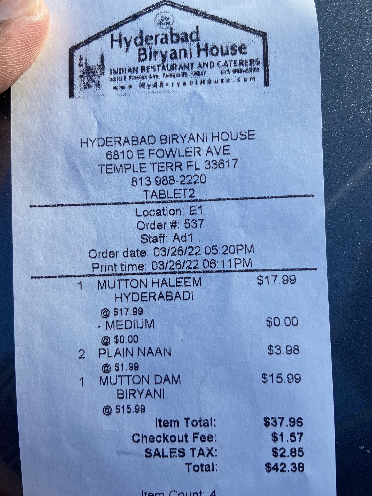 Read moreI would formally like to thank every person who makes Hyderabad Biryani House a reality. I have never had such delicious, fresh, and authentic Indian food until I came here. There is a wait sometimes, and it is a wait that I am thankful for. I graciously wait because I know it is a necessity for the highest quality food at its freshest possible state. If you want your food to come out quickly, and you are impatient, then you can go to any of the other Indian restaurants that most likely make their curries and sauces in mass quantity and then reheat them for days afterwards. You will never have this unpalatable experience at Hyderabad Biryani House. The Indian coffee is not on the menu, but it is quite tasty and worth asking for. The mutton/goat comes on the bone, but is more meat than bone. The last Indian restaurant I went to was in West Palm Beach, and there was definitely more bone than meat. The Dam Chicken Biryani was to die for. The chicken literally fell off the bone. The paneer was moist and fresh, unlike the rubbery texture that you find all too often at other Indian eateries. The Gobi Manchurian was flavorful and crispy. The samosas were quite spicy, but worth the temporary pain because they were so delicious...nothing a little bit of Mango Lassi can't handle, anyway. We also got Mutton Qaday (spelling?), which was a nice alternative to the Mutton Curry that I always get. Having Halal meet is certain the cherry on the top, so to speak. Enjoy this God's gift to humanity, giving us all a little taste of Hyderabad here in Tampa. I went again a week after writing this original review to try the Mutton Biryani.... I can't believe how much meat they give you! It is at least five dollars less than all of the other Indian places I've been to, and with twice the amount of meat. Please...