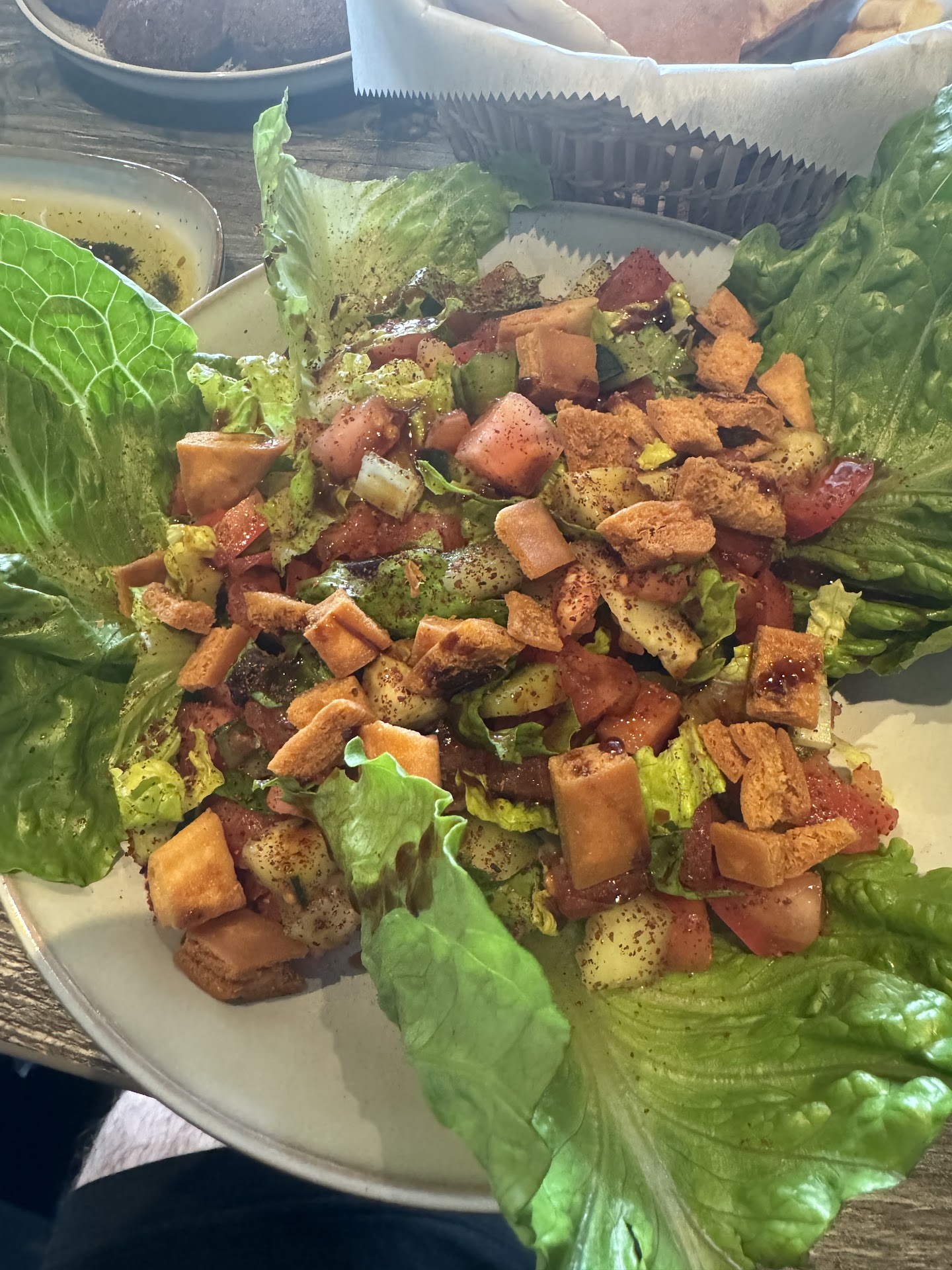 The Fattoush was well executed with pomegranate present throughout the dish and traces of the sumac and the lemon juice as it should be along with the delicious fried pita. While the falafel was fried to perfection perfect temperature and not too soft to where it falls apart and not too rigid to where it hurts to eat it and is insanely crunchy the texture was 100% balanced. The tahina sauce was wonderful texture as well creamy and not loose but not overly thick just perfect as it should be.