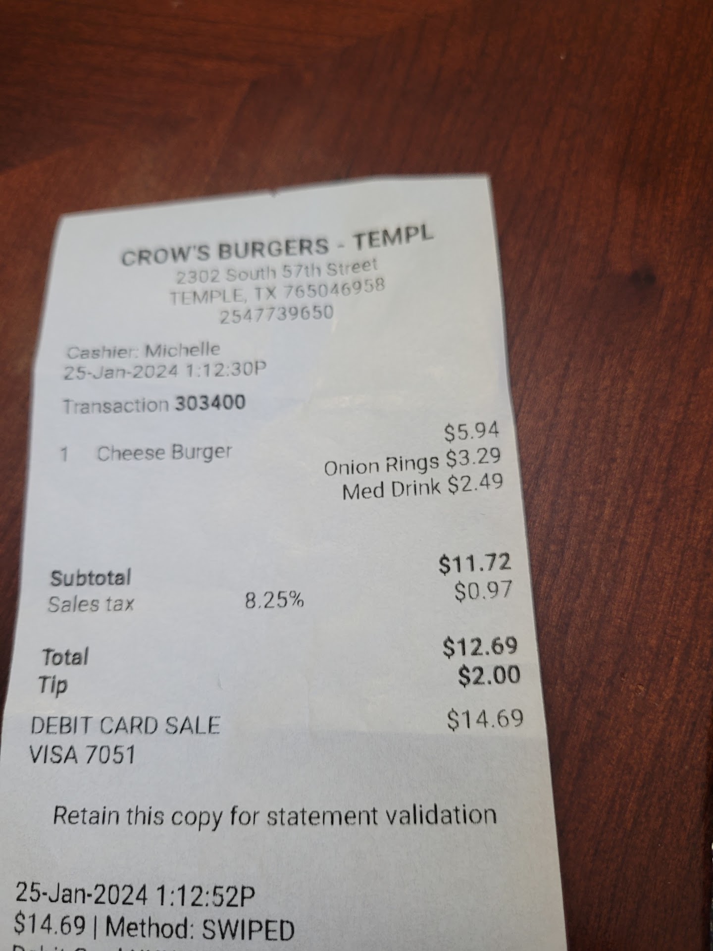 Read moreI visited because I was really wanting a burger recently and was having a huge craving for some great fries. I have visited the Crows Burger Shop in Belton many times and the Temple location once before. I love the burgers and fries at the Belton location and my experience at the Temple location was not outstanding last time I was there. I was actually on my way to another burger place this night when I saw the Temple Crows location and made an instant decision to stop. I wish I had kept going. The fries I was craving tasted like old oil, were cold, and stale. The burger buns were grilled too long and were burnt on both the top and the bottom bun. The last time I visited in May 2017 I was told the milkshake machine was broken, and I received the same response when I tried to order a milkshake this time. These two experiences have led me to say that I love the Crows Burger Shop in Belton, and if you want a Crows' burger my personal recommendation would be to go to Belton for it. From now on, if I have to stay in Temple to get a good burger, I'm going to visit...