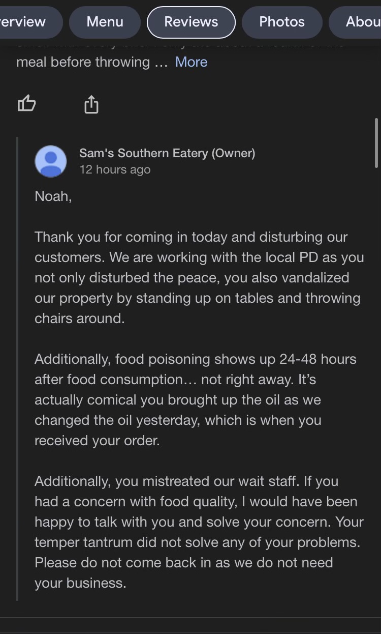I appreciate the owner for embarrassing themselves and their chain with their most recent reply to the review before mine. I came to share my wrongful experience and noticed on the most recent review the owner had assumed they were replying to me, but instead backlashed to a customer sharing a similar food poisoning experience as mine. The owner should have known they were not addressing the correct customer since they are supposedly contacting local PD. My full legal name is clearly printed on both my receipt and their merchant copy from the credit card I had used that day. Very embarrassing behavior for the owner, but matches the storeâs values spot on. Iâve attached a photo in case they decide to remove their mistake. The ownerâs reply to this customerâs review is not only unprofessional and child-like, but distasteful to say the least! (pun intended)