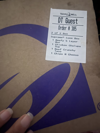 Read moreI'll start off by saying I ordered two chicken quesadillas with none of the jalapeno sauce when I got home those quesadillas had jalapeno sauce in it I ordered that for my children its to spicy obviously for them to eat so the food i paid for i trashed it and cooked for them instead so i Let that Go as well maybe they are new or something and then I go through drive-thru tonight thinking I'd give them another shot BIG MISTAKE!!! Fernando "If that's really his name" managed to spill my red sauce all over the top of my food that was placed in the bag instead of putting the tray on the bottom of the bag like you should or a new bag and then Milo "if that's his real name" gave me medium cups and said that they were large as if I don't know the difference and he said well whenever we give ice water these are the largest we can do well okay then charge me for a large then like I asked duh lost business if you ask me! the customer service is beyond lacking it amazes that at people with absolutely no skills can get hired my food is never correct the people are rude and then and to top it off while Taco Bell is under construction there is no plastic to separate the food from the rest of the contamination which I'm pretty sure you're not allowed to serve food if it's under construction and yes workers were there working construction inside the building I'd give 0 stars but I don't have the option to do so P.s. i also ordered extra cheese on my tacos was a very big order for 8 people actually and it was basically a pinch cheese if that! i get they want to make a profit but when i pay for extra you would think i would at the very least get what I paid for! Never going to that...