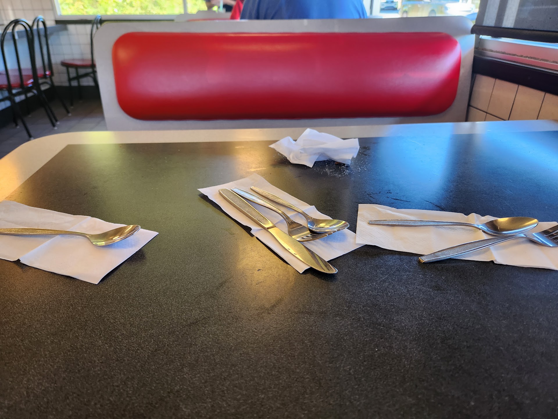 Read moreLunch on Sunday. Is it busy yes, but when I walked in myself with 2 kids and sat down at 1 of the 4 open tables ( all dirty ) I was met with dirty looks but who cares I have 2 small kids I wasn't going to stand and wait. I was met with a server who then placed my silverware on a dirty table and took drink orders. I was naive enough to think she would eventually wipe the table down that she was just busy .... but she didn't. It had sugar all over the table and spilt water. I cleaned it up and pushed it into a pile and they still ignored it. They then continued to clean the other 3 tables thay people were sitting at but now mine. The server was b I. T.c. h I. But 1 of the managers was happy to help me change my order to a To go order. Paid for 3 drinks I didn't get to drink and the meal that I really wanted to sit and enjoy with my children since I'm a single mother who works full time. What a waste the only people smilling were the lady sweeping the floor , the cooks and a super sweet lady who made faces at my baby. The manly looking lady......
