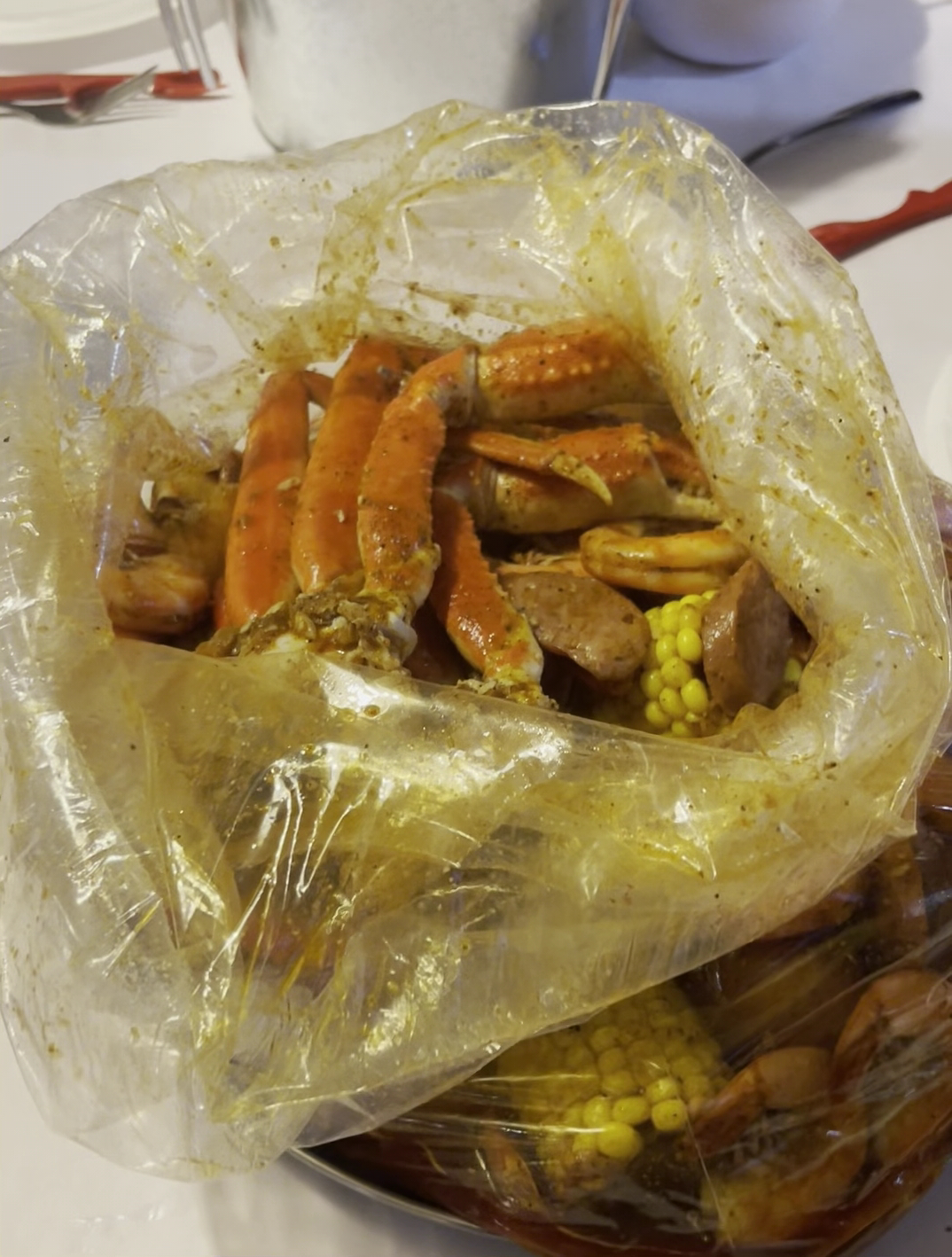 After about 45 minutes a lady brings us out seafood boil and sets it on the table then walks off and said she was going to get us some plates. After about 5 minutes she comes back with the plates lays them on the table and walks off. She didn’t ask if we needed anything or offer to help shake the bag or anything. We shook our bag and opened it ourselves.