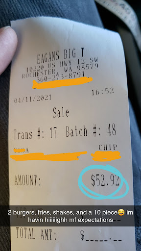 Read moreI've always had good food here at Eagans.. Yes the wait can be longer than expected because of the people calling in orders ahead of you, esp with Covid or lunch/dinner rush. This is not heat lamp food, its made fresh when you order it. I'll admit I've waited longer than I've wanted, but if you are in a hurry, call ahead with your order or go to a fast food chain place..Your burgers are waiting for you on a metal heated shelf under a light bulb! These burgers are not your run of the mill fast food.. These are tasty & of good quality. You wont find a dollar menu here. The Big Tom burger is always my go to.. Get the goop for your fries. Milkshakes are very pricey unfortunately, so that keeps me from ordering them. I appreciate the staff, it's never an easy job to please a big fast food customer base..people have great days, & off days..I just got the Big Tom basket today, and am pleased again. I'd like to see prices on the drive thru menu board that have been all blanked out for quite awhile as of...