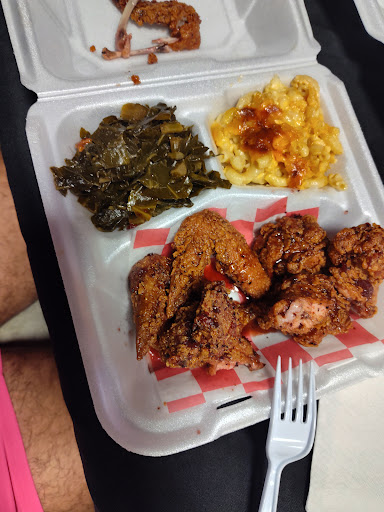 As soon as you walk in, the place immediately gave me the vibe that I was in the right place, that I was home. We were eagerly greeted and walked through the menu as first-time enjoyers. 10/10 customer service across the board. The person helping us was incredibly patient, enthusiastic, and welcoming. My friend got the normal wing plate with mac n cheese and cornbread. I ordered the Jamaican Jerk Jolly Rancher 8 piece wings with mac n cheese and collared greens. You read that correctly, JAMAICAN JERK JOLLY RANCHER. Now I will be honest, the price is not as cheap as you'd expect, but you will gladly pay it and it'll be money well spent.