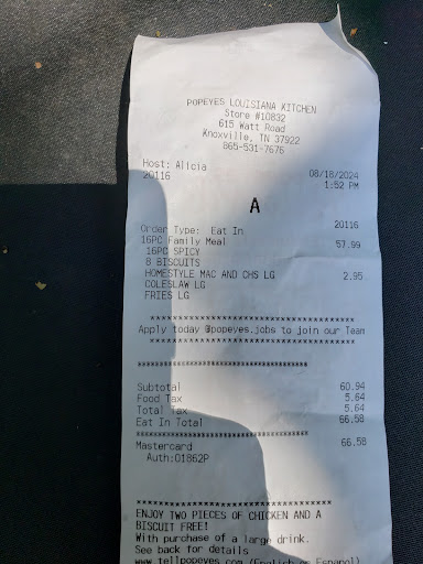 This restaurant needs to close down the food was horrible and by horrible I mean I was given over cooked chicken and fries!! You couldn’t even eat the fries or attempt unless you wanted a few missing teeth!!! There was like a handful of fries that was decent! The chicken was over done you can tell when you can’t eat the outside but let alone the white meat of the breast was hard! We were on our way to Gatlinburg the reason we stopped here and if I wasn’t trying to make it to our destination I would of did a u turn but we were already traveling from Alabama and was ready to get to our destination! The workers was rushing to take the order I’m thinking we about to get some good food I opened the boxes before I left and everything was hot as in steam but once we got on the road and made our plates we noticed how sorry it was! Definitely need new cooks!! Ridiculous paid almost $30 ish for some crap! It went into our hotel trash! Never have I had Popeyes...