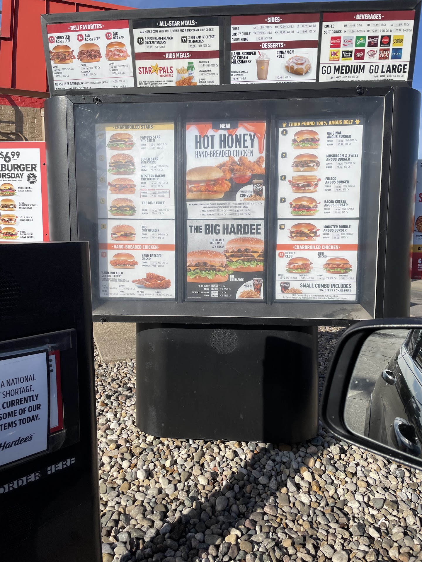 Read moreWent to this Hardee’s around 7pm today. The girl on the drive through kind of had an attitude. We were not rude to her. When we got to the window the guy and girl were laughing and acting suspicious AF. Dude went to bring us our food then took the bag back to the counter and just stood there for a second. They stood there saying something to one another while covering their mouths then eventually brought us the food. They left out our curly fries (that I was charged for) and gave me a small when I ordered a large combo. Hopefully that was the joke. Maybe they were just goofing around. I don’t know. I could just be crazy but my gut said something was off and I didn’t trust them. I didn’t consume the food or drink and went...