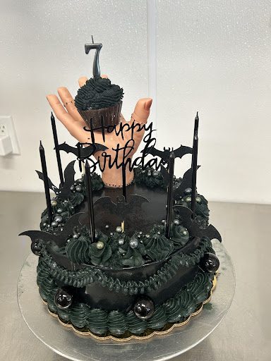 Read moreI had so much fun creating this spooky-chic birthday cake for a very special 7-year-old! Layers of rich chocolate, dark buttercream swirls, and fun gothic touches — complete with bats, pearls, and a hand-held cupcake topper for that extra “wow” factor.