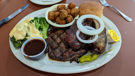 Amazing service. Had several people walk by and ask me if I was okay or needed anything else. Food got out pretty quickly. I got the cheddar cheese filled jalapeno poppers for an appetizer, and they were delicious. Then I got the Terrell special, that includes an 8 oz ribeye and 4 ribs and either your choice of a baked potato or two sides. I opted for the two sides, and got cheese covered broccoli and okra. Everything tasted good, but I would say that the steak was fairly thin, and the ribs were really dry. Nothing that a little bit of barbecue sauce couldn't fix, which they brought me as much as I wanted. I also appreciated that they included a few slices of onion and a roll and a pepperoncino as well. I was $45 out the door just for myself, and I only had water to drink. But overall it's pretty good. I would say however that it is pretty expensive for the quality that you get. Also, the seats are the most uncomfortable things I've ever sat in in my entire life. They are super straight up and down to the point where I was actually forced to lean forward, and the padding is very thin and uncomfortable. I'll probably be back, but I wouldn't rank it as a top steak joint. See my picture of what I...