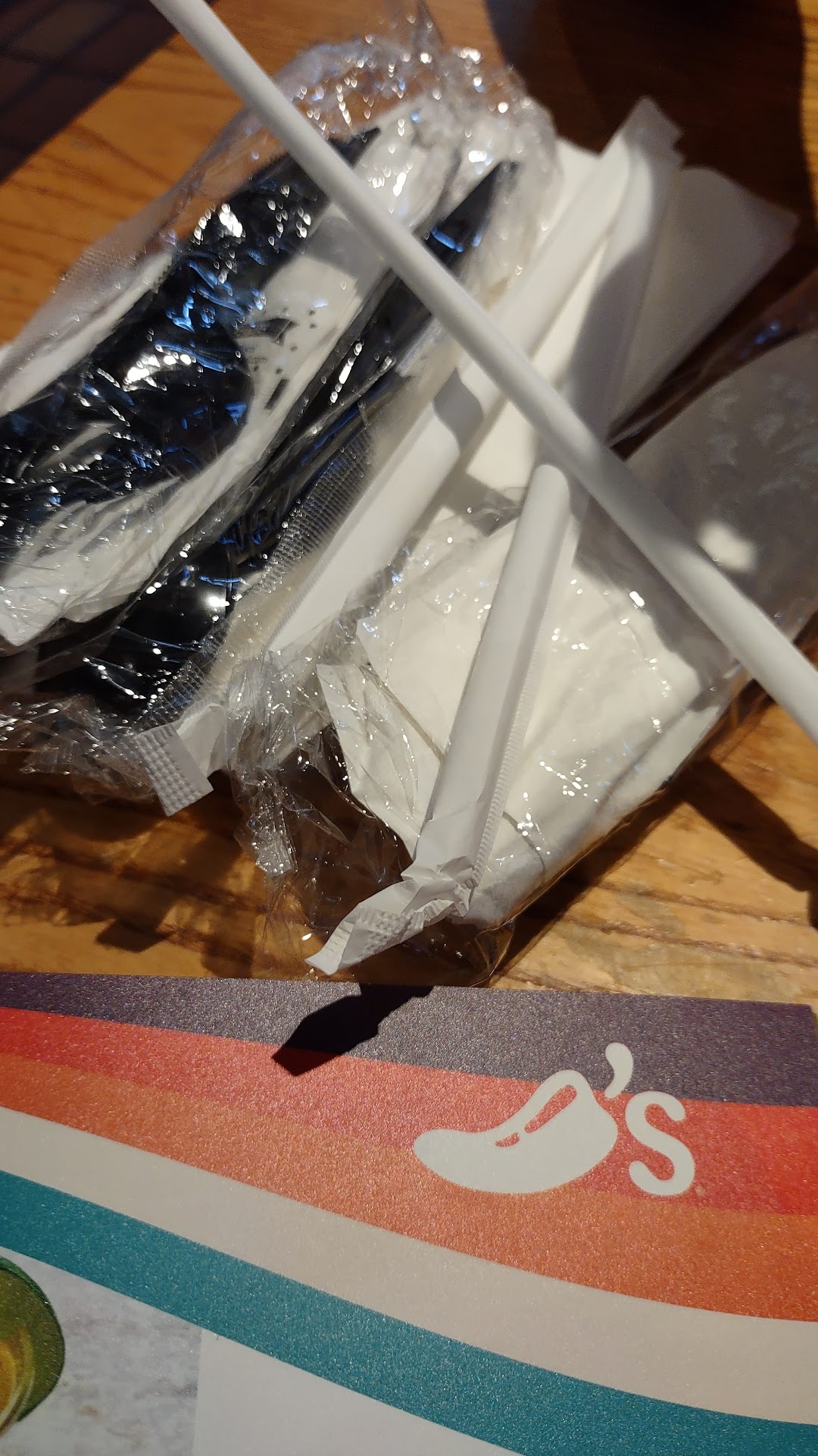 Can't even have real silverware anymore? Plastic utensils like it's KFC. And not even any tops for the presidente margarita shaker? Not enough employees. What's there are just playing or acting like they are cleaning. I will not return to any chili's after this. I've been a patron for over 35 years. Enough is enough. Chili's is a...