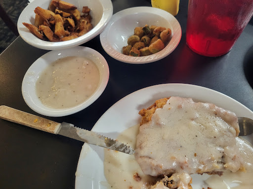 Wife ordered her tea, along with what she considered, "The BEST chicken fried steak she has ever had." And on the sides where mashed potatoes as well as the green beans, in of which she thought were bland and just so-so. The white gravy was not over peppered as many may do, but also mild in flavoring. ....back to that main star (chicken fried steak) was so tender, and the breading was delicious, just could not be topped.
