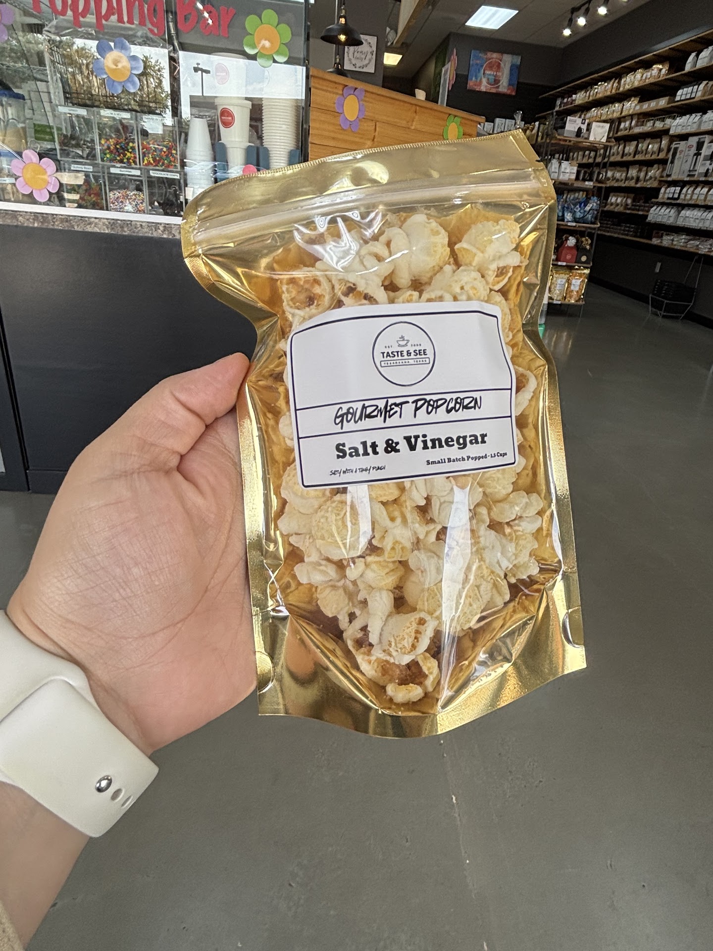 We tried the salt & vinegar popcorn (sampled a small bag, walked out with the big one 😅), plus cookies & cream, spicy pickle, and the Twice as Nice (a caramel + cheddar mix). Every flavor was so good.