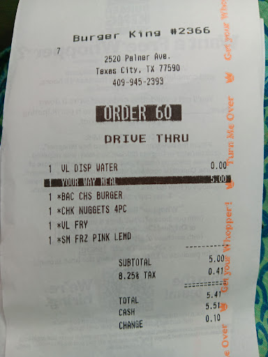 Read moreDrive thru never very crowded. Cheeseburger VERY good & French fries absolutely delicious! We go quite often & had to laugh at this experience. At first the order mic must've been turned down. We couldn't hear him & kept yelling our order & trying to explain our meal....2 Cheese Whoppers. One is free with coupon plus 1 French fries. Got to window & finally understood we had to order a drink too, to get the free Whopper. Ok, no problem. What we ended up with - 2 cheese Whoppers, 2 drinks & 2 large fries & 1 small fries. DUH?? After all the "back & forth" trying to explain, we just left & enjoyed our meals at home! ...