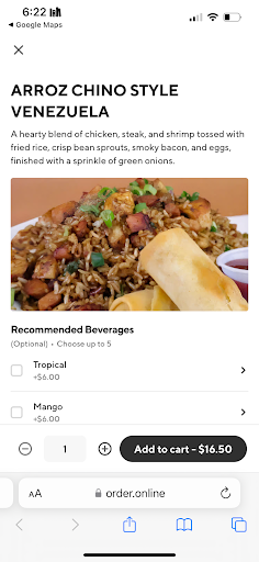 Read moreNice service but el arroz chino to-go nada que ver. No shrimp, no beef, solo chicken. No cheese for the mandiocas either. We will pass on this one.Your menu is misleading with the fried rice. No green onions, no scrambled eggs, no bacon Misleading. The server should’ve...