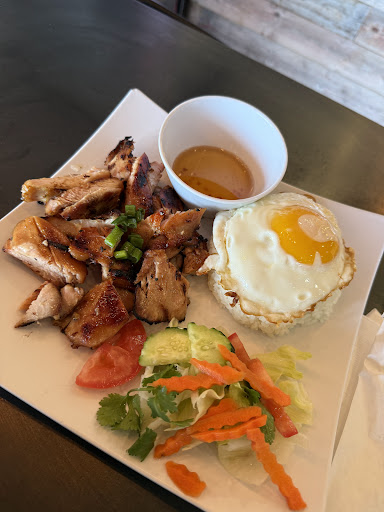 Inside, the space is clean with ample seating, making it easy to dine in without feeling cramped. My usual order is the Grilled Chicken Rice Plate--tender, well-seasoned chicken served with pickled carrots, cucumbers, tomatoes, green onions, and a perfectly runny egg. Add a splash of the fish sauce on top, and you've got a satisfying, well-balanced meal for just $12.65.