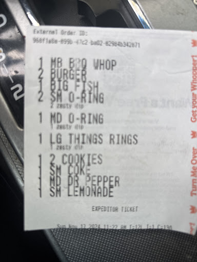 Read moreCame in tonight to get a quick little meal for my children and myself to only feel like I have wasted my $17.00. Walked in and seen they had a big heaping warm fries passing them out like hot cakes so I knew I needed to ordered fries with no salt to make sure they were hot n fresh. Well a rush comes in behind me in the lobby and the drive thru line got long as well. So 20 minutes later we receive warm fries because the fries came out the dryer and sat there til they actually put them in the fry box and on our tray. Mind you the tray holding our burgers and nuggets had been sitting on the counter the entire time. So for $17.00 I ended up with 4 cold ass bacon cheeseburgers that looked under cooked, cheese wasn't even melted or bent like it had received any warmth to it, some barely there microwaveable sickly looking bacon, 1 cold ass dbl cheeseburger and some dried out hard as a rock chicken nuggets my six yr old could barely chew. Wanted to go back to the front to complain but was too tired to do so. Then they didn't have any ice in the drink machine and the young kid seemed to possess a attitude because folks was asking him to fill their cups with ice since they obviously had ice to hand out through drive thru. I am disappointed I used to work for BK in my teens and never did we hand out poorly made food. This place has sucked tail since I have frequented with it but not anymore. Will drive to a different location if and when I choose to eat/spend money with...