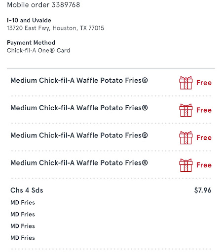 My family and I have been to at least a dozen Chick-fil-aâs in the Houston area multiple times. This location is average. The drive-thru order takers/cashiers are above average in hospitality and attitude. It was actually shocking how sociable and pleasant they were the first few times we visited and then we started looking forward to it. :) The 3 star rating is due to the fact that the order ahead and pickup inside feature on the app is absolutely pointless. I tried it multiple times and it always took longer than the drive-thru would have despite ordering ahead. I suppose since theyâre so committed to the drive-thru perhaps they forget to get other orders out. One visit in particular I used rewards for 4 of my 8 fries (we have a large 8 person family). They didnât give us those 4 fries even though they were clearly on the receipt and in my order on the app. Good thing, I checked the order before we headed home, but now Iâm not happy because the food will most likely be cold. My husband goes in to get the fries (with the receipt) and comes back 10 minutes later and says they wouldnât give them to him unless he paid⌠I was honestly so irritated. I went in myself to get his money refunded. (Food is definitely room temperature now - $70 order). I go in and explain to what seems to be some sort of supervisor that my husband was charged for food that we already paid for and that it was their error in the first place. (Iâm calm and direct). She âsmartly and politelyâ explains that she just helped him, and falsely claims that we did not pay for them and thatâs why they werenât in the bag in the first place. I hand her the original receipt and say we paid online and ordered 8 fries. Itâs clearly not logical that the app would just not ring us up yet tell them to prepare our total order. She goes on to explain to me that âusually rewards would be labeled on receiptâ and started to show me where, as she realized that she was full of âchick-fil-a sauce.â She interrupted herself and said Iâll get that refunded to you right now. NO APOLOGY! All of our dinners were cold. In my book, taking money from customers and assuming that theyâre in the wrong before yourself is TERRIBLE CUSTOMER SERVICE. I donât care how big your smile is when you do it. Dare I say we were treated this way because we had a long day as business owners, were dressed down and I wonât mention what I think it really was. If the other employees hadnât been so pleasant during previous drive-thru visits, then I wouldâve rated this location with 1 star, but this ridiculous experience is enough to make me...