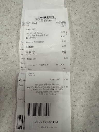 Read moreI love to take my son to Chuckie Cheese just because itâs a fun place for a kid and affordable. Yesterday I brung my 8 year old to this location and the experience just was horrible. From the moment I walked you the cashier (Nadia had a horrible attitude it immediately changed my energy but I tried not to let it bother me I got my son play time plus a person pizza and us drinks. Have most of all the play time was up around 30 minutes I went to counter nd let her know I wasnât please with the wait if I knew it would have taken that long I would have gotten a medium. I went ahead and changed it and payed the difference that when the manger stepped in to assist with that the manager was a older woman and (Nadia) the cashier continued to have a attitude with her now it made me very uncomfortable watch her disrespect her manager in that way. Once the pizza come it was perfect and hot my my son ate and played a little longer when it was time to go we went to ticket counter where (Nadia) swiped my son card look at us and said â He only has 50 Pointsâ I tried to dismiss the statement but couldnât as I found it extremely disrespectful saying words like that to a 8 year old are hurtful as they are there to have fun and if if they didnât earn a lot of points shouldnât be told that. I explained to her how her statement was inappropriate and she just rolled her eyes and brushed it off. Also when we were leaving out no one was at the door to check our wrist we just walked out and left which was disappointing because I always loved that they had security policies for matching parent wrist to childâs Just wanted to share this experience so that the staff could do...