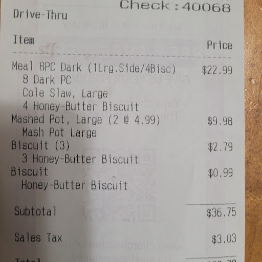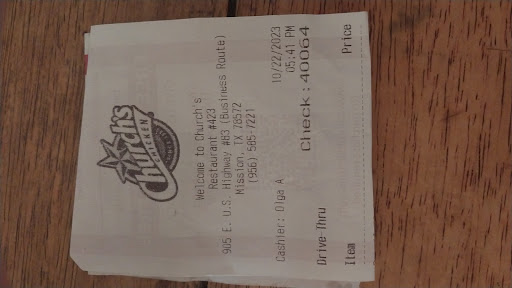 Read moreChurches chicken is very good chicken.The chicken is always cooked right and never disappoints whether you like white or dark meat.Although I would say that they specialize in dark meat but all is good.I also like that they have a good variety of sides,its not the standard fries or mashed potatos there's other choices.also in the drink dept they have fresh brewed iced teas in a variety of flavors as well as the standard coke,sprite etc,etc.The staff has always been polite and prompt.to this day Iv never had an issue.So as far as this review goes I highly recommend this location.If your in the mood for some nice hot fried chicken at a reasonable price this is...