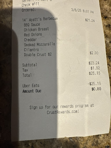 Read moreMy wife ate here the first time and had the Hawaiian thin crust pizza. Wow, it was amazing. This is our second visit so we can have an indepth dive into their menu. The outside is welcoming. The patio is covered with tables, chairs, music from the speakers and a play area for the kids to play. Once you walk inside, you immediately feel relaxed from the unique lighting and the modern design. Ordering your food and drinks is simple by walking up to the counter. Now, I will tell you about the food. We ordered the Carl's King double crust pizza, Blackened Chicken Capri and the Crusted Goat Cheese Salad. OMG, when I tell you it was soul movingly good. Believe me. I immediately signed up for the CRUST REWARDS which gives us 1 point for every $1 spent. They also give you 10 bonus points for signing up. Most importantly, the entire Crust Team is AWESOME ! You won't reget the visit. We will return to Crust again...