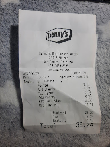 Read moreMost of the time when I go to any Denny’s location I normally have a great experience. However when I visited this Denny’s location I will have to say it was the most unusual experience I’ve ever had. Like I’ve never had my server have to sit down at the booth I was sitting at to take my drink and food order acting like she didn’t want to get back up again which kind of made me feel uncomfortable. I guess I should have never looked at her crazy for sitting down at the booth with me because once the food came I needed a drink refill and I never got one. It was like she had disappeared because I didn’t see her anywhere the entire time I ate my meal with no drink. Finally 10 minutes after I finished eating she appeared and brought me the check and asked if I needed a refill. I said yes then it took another 15 minutes to bring my drink refill because she disappeared again. When I had got up to go pay the bill I was walking past my server on the way out and she gave me the most creepy side stare and smile when I walked past her. Overall my experience was creepy. I have my receipt so I know the servers name but to avoid any backlash I won’t put her name on...