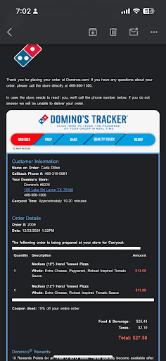 Read moreSince the pandemic started, my family and I have been really cautious with when we leave and get food. We decided to order Dominos because on their website they offered "Contactless" delivery. Which is why we chose that. We usually don't do delivery. When we do get Dominos, I just go to pick it up since it is literally three minutes away. We order online, add a tip, all with the delivery to be zero contact. We are watching the order being prepared on the app. It says it's out for delivery. Next thing I hear is my door bell being rang and the driver waiting for me at the door having me sign a receipt and to hand me my pizzas. Some people aren't worried about this. I am not one of those people. We have been personally effected by this. I asked the driver "I though this was supposed to be Contact-less delivery". He replied, "Yea that's more of a suggestion." Ever since this Dominos was put in Lavon I have had bad service in some fashion. This is the last straw. DON'T ADVERTISE SOMETHING IF YOU'RE NOT GOING TO DO IT. From now on, I will order my pizza from somewhere else. I would rather have a frozen pizza from the dollar store. But I know you don't care, as the service hasn't gotten any better. So have a great day...