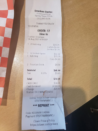Read moreI wouldn’t recommend that place to anyone. The customer service is horrible. When we walked in the door it was a group of people to the left of us eating and they all starred looking at us as if we didn’t belong there. Once we reached the register it was a man and a women up there. The woman was “semi friendly”. She started taking our order. I ordered shrimp and fries and my grandmother ordered shrimp, fish, and oysters. The whole time we were ordering the man was staring us down and making little side faces all the way up until we pay. It almost seemed like he thought we were going to pay so he just wanted to make sure. It was very uncomfortable but funny at the same time. We sat down and the table was clean surprisingly seeing as too all the other things didn’t look so clean. The wait time was not so bad it took about 10 to 15 minutes for the food to come out. Everything looked great when it came out. The shrimp were good and my grandma said the fish was mediocre but the fries were soaked in grease and the oyster were ridiculously horrible. Now the only reason we went there is because my grandma loves oysters and it’s called drunken oyster. As we were getting up and leaving they just stared at us not saying goodbye or thank you for...