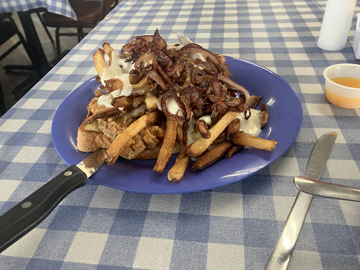 The food is good diner chow. I had the Big Country that came with a nice side salad. Entree was chicken fried steak on top of Texas Toast, topped with what seemed to be a cheesy cream gravy with hand cut fries, grilled purple onions, and diced bacon. The steak was a real cut of meat with only 2 chewy bites. Great for CFS. The toppings, oddly enuf, all worked together.