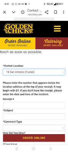 Read moreCame here with the wife we both ordered a combo, chicken was decent not spectacular but okay enough to eat. The problem came when we got our 8 piece jalapeño poppers that were almost inedible because they were close to being burnt they were past golden and more of a dark coffee color I took a bite and let my wife try and we both could barely chew it. My wife took the 7 poppers that were left and talked with the afternoon manager showing him they were burnt and the first thing he said is I’m only giving you back 7 since you brought me 7. Wasn’t apologetic or showed any real concern. He then came 10 minutes or so later to our table and asked us to try them and again told he only brought us 7 back because we didn’t give him the full 8 piece, he wanted to clarify that! The poppers were made perfectly and were so good but overall my experience there was not so well the food didn’t have much quality to it chicken was dry and fries were soggy and bland, churches chicken is on top!!!! the reason for this whole review is because the manager imo with all my years of kitchen and customer service experience I think could of handled it better, no matter if we ate 1 or 2 they were all burnt so replace the whole 8 piece it’s not about us wanting more food we can careless about that it was just the principle of him being greedy and also making golden chick look hard up. I would finally like to mention the cashier light-skin hispanic was very nice and had great customer...
