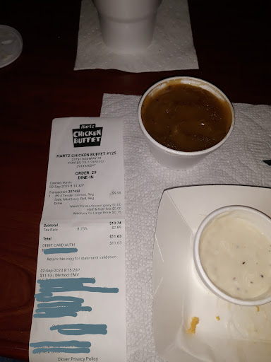 Read moreI love Hartz chicken...BUT Don't go here!! 12:20 on a sunday...horrible cole Slaw, hard rolls, old over cooked dry oily chicken, slimy old Cucumbers, over cooked liver and gizzards....but taste burnt.....old dried up fish and a super small buffet.......I am sooo disappointed I can't express it in words! Wings came out almost when we were about to leave (so they were fresh) grabbed 3...notices they just set the tray on top of other items(not even in the warming table) and wouldn't you know it......over cooked!! What a waste of time , money and I'm still hungry......this is not the way this place should be.....so...