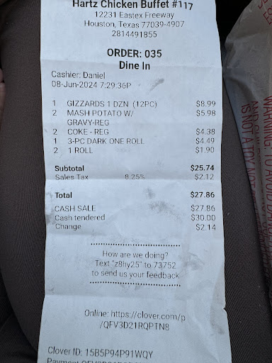 Read moreI visited Hartz today 7/6/2024 12231 Eastex Freeway Houston TX 77039. I am terribly disappointed in the whole food experience. The customer service was mediocre and the food was despicable!. The food lack any taste, it was just coated and fried. The chicken, okra, and rolls were poorly prepared. Not to mention fresh and old chicken were mixed together (for the older chicken meat had a dark grey complexion after being fried and unpleasant smell). Definitely not worth $22.15 I spent hoping to receive a good meal for my family to enjoy. The food set out for the steam table appeared not to be refreshed in hours which is why I felt it would be better to order the food to be freshly prepared for to...