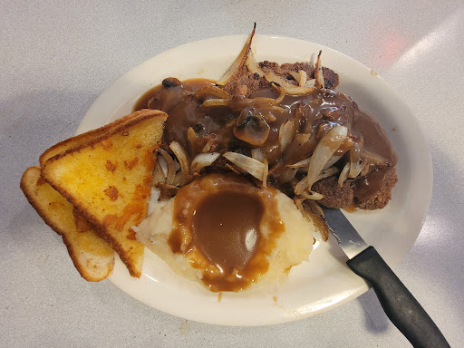I just left this establishment a few minutes ago... I had the Hamburger steak with mashed potatoes and a side salad, my girlfriend had the turkey melt with fries... when we we were seated the building smelled “old” and kinda like there has been a dog on the premises. My utinsils looked like they were used in Gettysburgh old and tarnished. Overlooking that, the side salad came. There were 3pcs of lettuce with the ends of two red onions, what looked to be old cheddar cheese and thick cut tomato that was almost liquified and thousand island dressing. Every bite tasted like raw onion. We were gonna cancel the order but our food came out with 4 mins of getting the salad. The mashed potatoes were completely over cooked like mush, and didn’t have any seasoning whatsoever, the brown gravy on top tasted like raw onion. The hamburger steak while cooked decent, had cheese, raw onions, mushrooms and gravy on top. Once I scrapped that off I could “get thru” the hamburger steak while it basically tasted like onions. My GF’s Turkey Melt has cheap cheese and that thick cheap turkey meat you get from store that has a smell to it... all in all we were there about 15 mins total, which I know means our food was not cooked to order. I think they are slow on business and there food sets, for how long is anyone’s guess but from the taste I assume was awhile. On a positive note, the waitress and staff were very kind, but I would definitely never eat there again. Good...