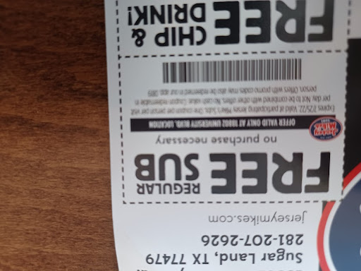 Read moreDo you get annoyed when you receive a food coupon in the mail for places like Jersey Mike's, Firehouse Subs, and the like, and in the print, it says, "Valid at Participating Locations." There is nothing wrong with this statement per se. The problem I have with it is that you don't know who's participating or not. I showed up to the Jersey Mike's, University Blvd. location in Riverstone and ordered 3 regular subs according to the coupons. After ordering the subs and preparing to pay, I was informed that the location was not a participating location. Imagine my annoyance, although I will admit, I should have inquired before placing the order. However, not wanting to waste food, I completed and paid for my order. Since the advertiser or Jersey Mike's FAILED to fully inform, as to the participating locations, next time, I'm throwing the coupons in the Trash 🗑!
