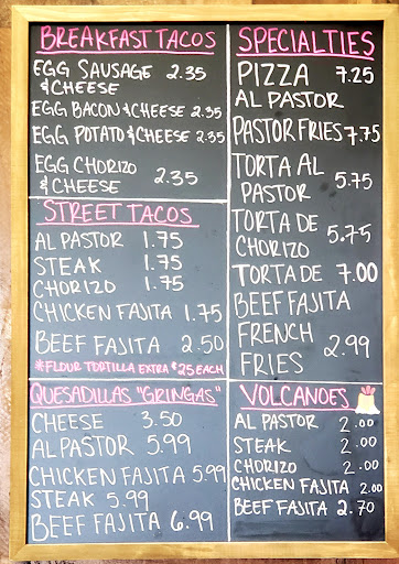 Ok now back to the food. So they do tacos, breakfast tacos, gringas (quesadillas) and Volcanoes. The tacos are great and you can get them on corn or flour tortillas. They stack them full of meat. Our kids love the chicken Gringas and the Pastor Gringas are also tasty. But two hidden gems are on the menu which I'm now addicted to and its the Volcanoes which is your choice of meat with cilantro and onions on a small corn tostada. They are small so you'll need a few to satisfy your craving. The other is the al Pastor Fries and they are SO good! The fries in a To-Go order is a bit bigger than the dine-in version and it'll definitely fill you up. Its waffle fries with queso Blanco and topped al Pastor. Fantastic.