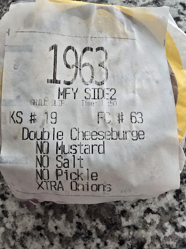 Read moreMISTAKE: I made a mistake and went back to this McDonald's. I placed the same order i always place at McDonald's so that I have something to snack on over the week. So again I placed an order for 10 double cheese burgers with no pickles, no mustard, no salt and Extra Onions. Well I got 10 burgers with pickles, mustard, salt and NO ONIONS. #6. @ 11:55 4-28-2025 â----------------------------------------- I ordered 10 double cheese burgers all made the same way. Granted, they WERE all made the same way. I ordered them with No Pickles, No Mustard, No Salt, and Extra Onions. Well, they had No Pickles, No Mustard, and NO ONIONS. I guess they were easier to make without the onions. That to me is what makes these taste good. So I got hosed on this visit. I even gave a tip. I parked in curbside #6. @...