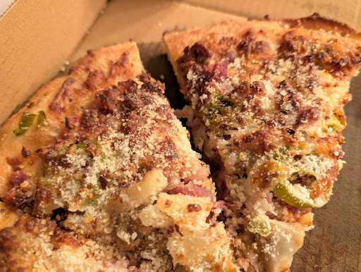 We had a group of 3 adults and two kids, large "cheese sticks" (cheese pizza), big hit with everyone, we ordered 2 pizzas, chicken wings, ravioli, and a sub sandwich. My pizza (pan crust x-tra cheese pepperoni, sausage, bacon, pineapple and jalapeno) was cooked perfectly. With that many toppings I am used to the crust being a little doughy, so I was extremely pleased with my order. Everyone was happy with their food and I will definitely be back for more. The young man who waited on us was very attentive and courteous for a well rounded dining experience. The only picture I have is one from my leftovers once I got home 6...