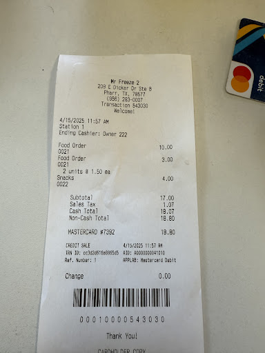 Read moreSnacks are ok, not the best but not the worst, the reason I put 3 and not 4 stars, is because they keeping increasing prices, $30 for some raspas are just too much, even charging a credit card fee on top of the already high prices. While I understand about inflation it even feels cheaper to go to a Texas Roadhouse than for...