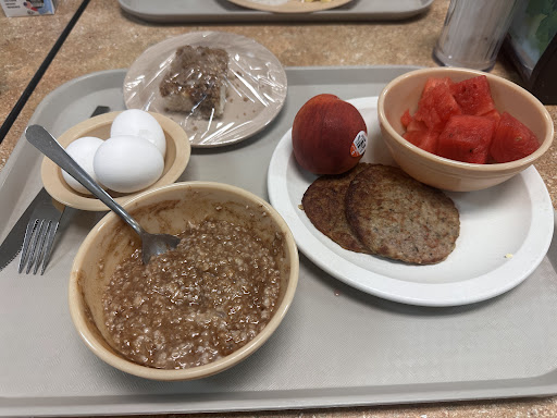There is a main line, grill line, short order and desserts for the fatbodies, salad bar, fruit, yogurt, cereal, milk, soups, matcha balls, ice cream sandwiches, and fountain pop.