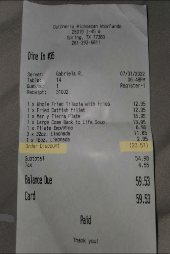 Read moreMexican seafood restaurant on the I-45 feeder Road heading to Houston Texas near The Woodlands Texas. In a strip shopping center it is easy to see from the roadway. But traffic is very heavy around that area. The parking lot is clean and wide and easy to park. They have a handicap access ramp. the restaurant is clean and the tables are well set up. They have a fish tank and signs on the wall offering their specials. The server comes over immediately and offers to get a drink and another server brings chips and salsa. The salsa was unusually good. The chips were also good just like I like them. I went for the lunch special because lunch specials are before 3 p.m.. you can see the menu on my photos. Most items are seven or eight dollars and that's quite a good special for shrimp and fish with french fries and rice and chips and salsa. Quite a good deal for a seafood meal on the lunch special. The food takes a little while to come out but they cook it individually. If you walk around the side you can see in the kitchen. That's a nice touch I like that to know that it's clean. The food came out and was very hot. It tasted very good. The breading was well done and it was cooked just right. It was a large portion and was over hanging the plate. It came with a piece of bread also. my total check for two people was $16. Plus I left a cash tip. It was my first time here and I will be back again. I'd had been to other of these restaurants in other locations. This one the food tasted just as good. I highly recommend this to anyone. Please leave a thumbs up if you like my review and...