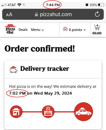 We ordered the Pizza about 30 mins before we planned to eat, but were flexible. We immediately received an email confirmation that the pizza was estimated to be delivered in 30 minutes, which exceeded our expectations.