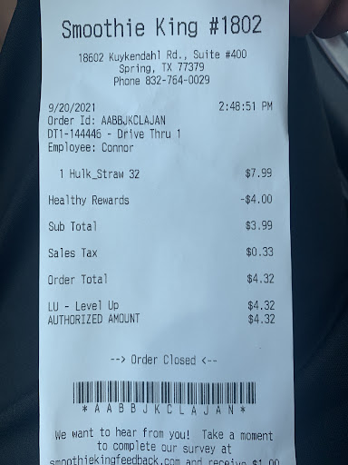 Read moreI pull up to Smoothie King with it's "Open" sign on at 8:50PM. I see they don't close until 9. I see an employee look at me as they drive away, I'm not thinking it's the only employee (I think it was now). When I walk up to the door it's locked shut. No smoothie for me... I work in food service, and I understand the desire to shut things down early, but that just did me so dirty. This was 09/28/2023. Update: while writing this review I noticed the open sign shut off at 8:58, and 2 female employee still inside. The hours are wrong. It seems like they don't want to serve until 9, they are completely closed by 9. I don't understand why the door was locked and the employees were nowhere to be...