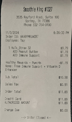 Ā Ā Ā Read moreFrom Louisiana worked at smoothie king in 99. I have a house in woodlands and here in spring. For the past week during lunch I've came and purchased nutty super grain, mango kale, peanut super plus, and something else, anyway each time they literally put at least one cup of tap water in each shake and today the consistency was so watery kylee put another cup of ice in a medium shake just to give it a thicker look so four shakes in four days all watered down and disgusting then I asked her do you guys always put a cup of water in the shakes and she said yes? Wow. I contacted a friend of mine that manages two stores in Harvey LA and marrero Louisiana who's been with smoothie king since we where 18 he said by no means do they ever put that much water in these kind of smoothies, sometimes at most a splash. Save your money or go to the other smoothie king...