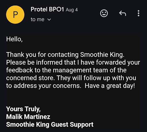 Read moreAbsolutely terrible customer service from Genesis, we arrived before closing time and we have 3 high schoolers with us 2 are foreign exchange students and one student insisted on paying for his own drink. So we place our order and then Genesis walks to the back area immediately without taking one students order. Comes back and says it’s 9 pm on the dot so we aren’t taking anymore orders. I was astounded by how rude she was towards us. And when I asked for her manager, her manager talked to me as if we arrived after 9, I told her we arrived before 9 pm and when she asked Genesis if this was true she said yes so then the manager decided to still take our students order. All the while, two other families walk in after us, well after 9 and they did not once get snarky remarks of them being closed and no longer taking orders. I will be sure to never go back to this location and share with everyone at the gym, my fellow board members and colleagues this awful experience. Never have I been so baffled to see a business refuse money when that place is about as empty as Fred’s Fish Fry every time I go in...