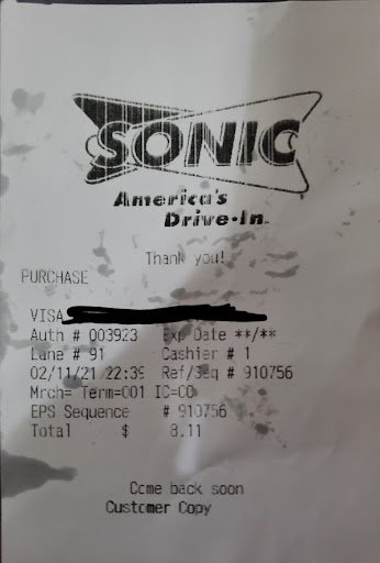 Read moreHello, to whom it may concern. I sincerely regret coming here to patronize this Sonic. I got in the drive-thru to order and I was told that the system was down, 11:50p.m. Okay, I parked in their parking lot, to check on Google Maps for other options. I noticed the light sign being turned off shortly. And the Sonic employee crew saying there fair wale for the night. One person by the name of Chris, so the entire team called by his name struck my vehicle. I didn’t understand what was going on. I find it hard that any person in their right mind would drive off the parking lot in a sporadic way without their headlights on and out into the street and came back into the Sonic. When he struck my vehicle I thought of a Hollywood movie replaying in the back of my mind as to what had just occurred. This Chris was about 5’9 or close to 5’11 when he got off the white Jeep with no license plates on it, but just the paper tags is all I saw. I feared for my life, because he was not professional in his behavior before and after the incident. I took this entire experience as a ploy and his intention was to intimidate me. I told him that I would be reporting this story to someone. I hope that the owner or manager would address this matter ASAP! And my prayers go out to this young man and his actions. He can have a bright future if he so chooses it. Best of luck to this Sonic and much success. I would hate for this location to go out of business, due to bad business practices....