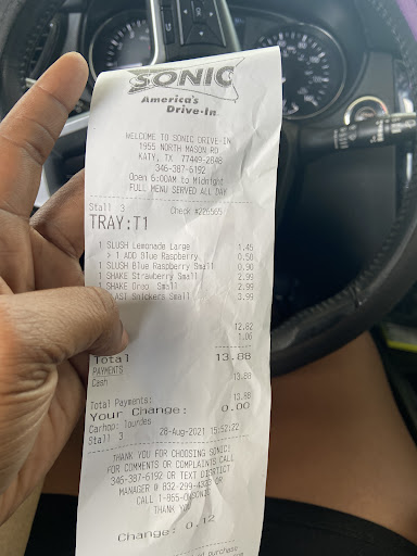 Read moreThis is the absolute worst sonic ever. First, I order the number 11 which is the tenders meal. I ask for buffalo and honey mustard and am charged extra because they only offer ranch, BBQ (not honey bbq), and ketchup as dipping sauces. I cancel the number 11 and just order drinks. THIS IS THE ONLY LOCATION IN TEXAS THAT CHARGES EXTRA FOR SAUCES AND NONE ARE PROVIDED WITH YOUR MEAL. I have had to deal with this EVERY time Ive come here. There is no diversity at all and staff cant jnderstand what you are ordering half the time. Its so close to my house but Ill drive farther for better service. I intend to call their corporate and ensure this is their policy because if so there could possibly be an advertisement issue. You charge me extra when your sign says you offer...