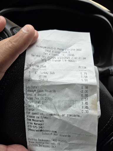 Read moreI had a negative experience at the Subway at 2864 Loop 1604. Walked in and waited in line. One individual was doing all the work. Waited patiently as he took care of the customer ahead of me. There were 3 other employes standing around talking about shifts and doing nothing. A useless area manager was holding court. Another customer walked in and said something to one of the employees who dropped everything and began putting a sandwich together and the customer sat down at a table. They all continued to ignore me. I had been waiting and waiting. I finally protested and asked how much longer it would take to take my order. She got defensive and said we are all busy. I told her there were 3 other people doing nothing. She responded that one was an area manager. I told her to put him to work too. I complained to him. He just said sorry and continued to stand there doing nothing. I finally got my order. I paid and asked for a receipt. They mysteriously could not provide one. I ordered three 6 inch sandwiches. They charged me the footlong price for one of them. As I left I told them I would never be back. As a previous business director I was surprised this franchisee would hire such a lame area manager who could not rise to the occasion and provide good customer service or even remedial interaction to keep a customer happy. I would have fired him on the spot. A reflection of his incompetence was the sour attitude of 3 other employees. This location needs to be cleaned out and new people...